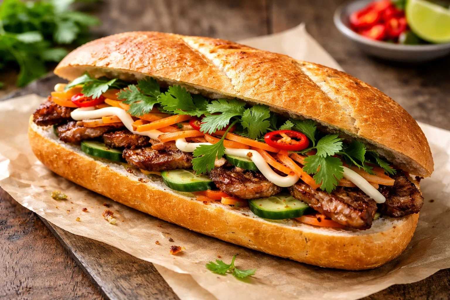 This crispy baguette sandwich combines French influence with Vietnamese flavors, filled with meats, pickled vegetables, and fresh herbs.